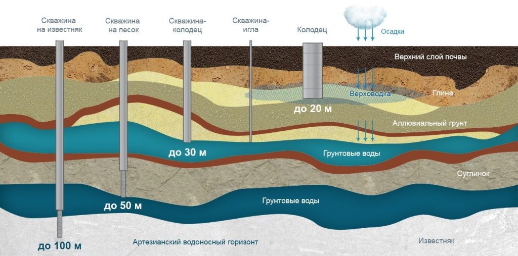 В зависимости от глубины водного горизонта и требуемого объема потребления воды, существует несколько основных типов скважин: